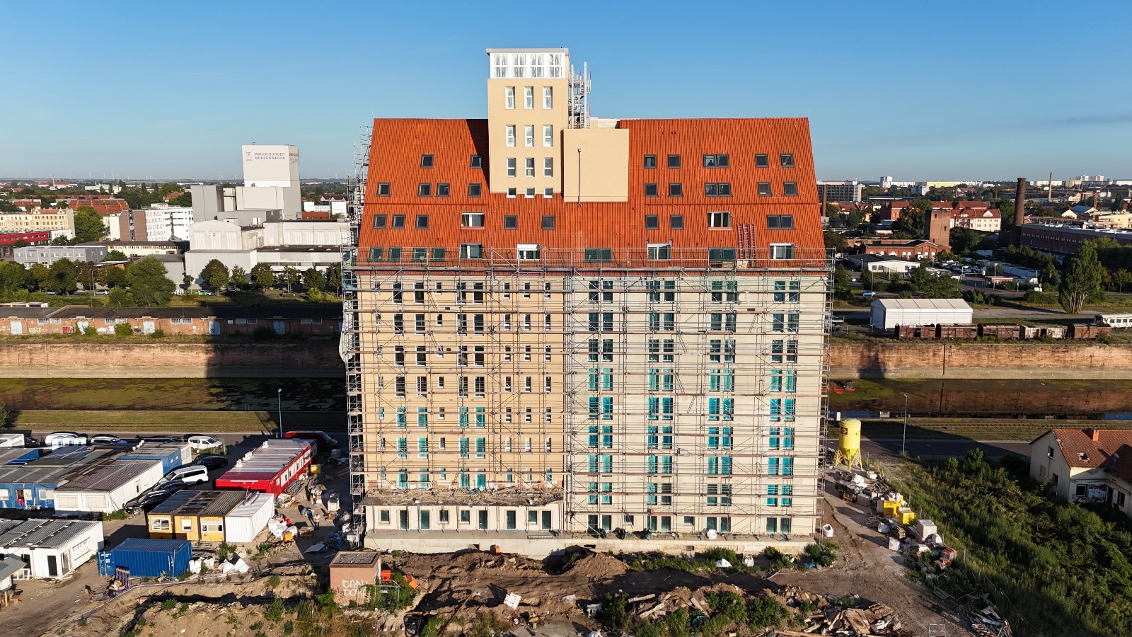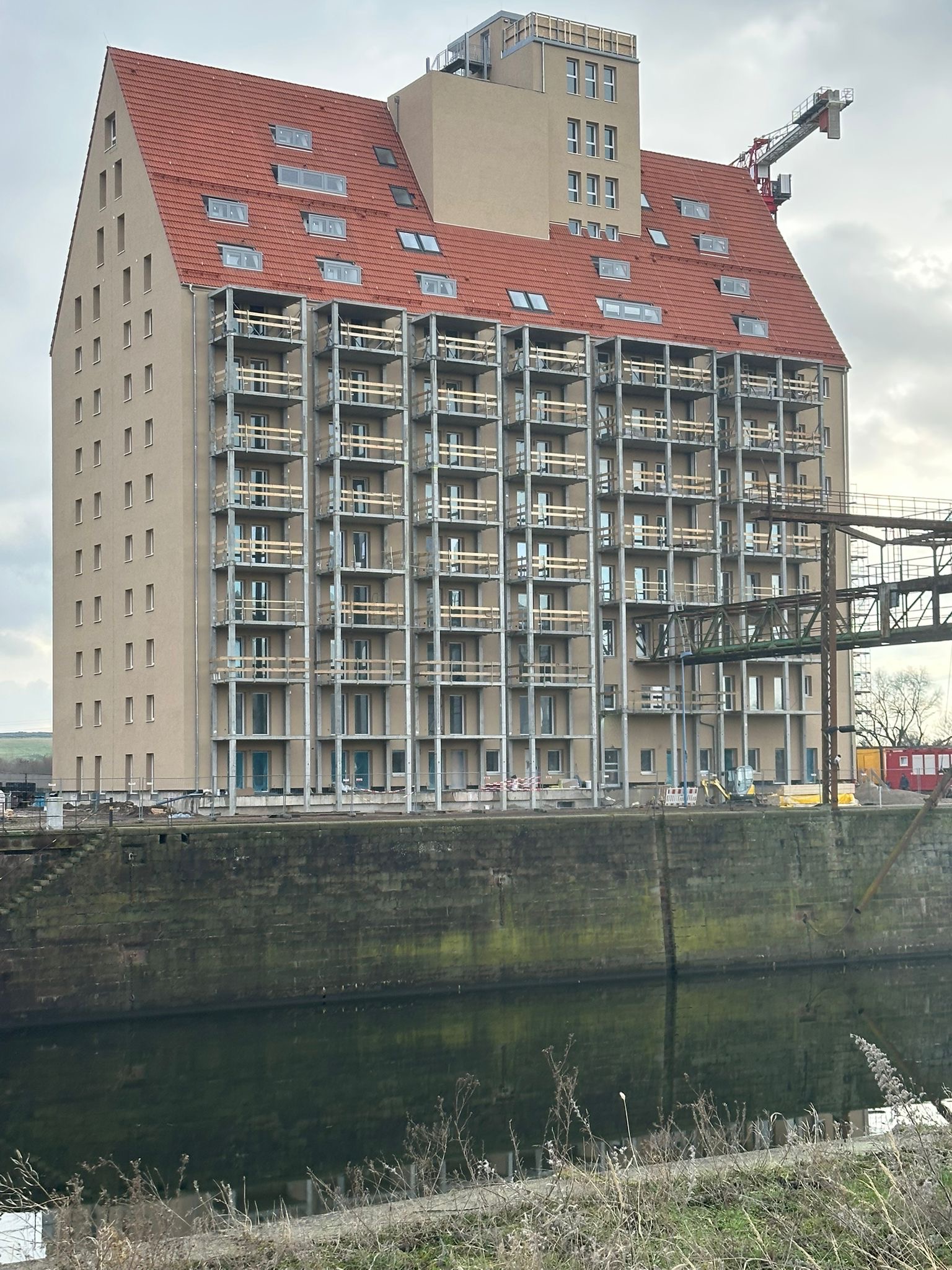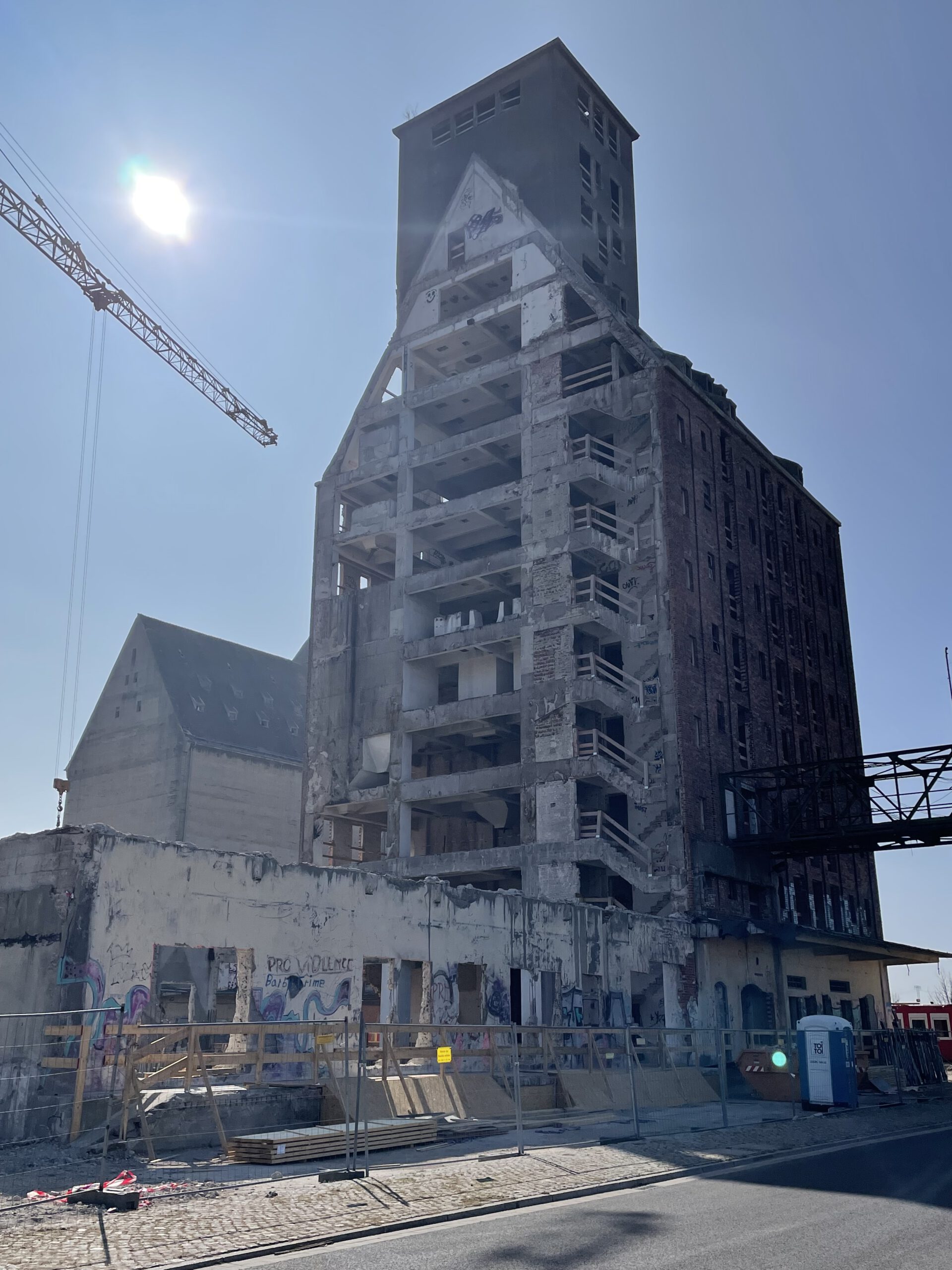 Das 49 Meter hohe Silogebäude B in Magdeburg wird umgebaut und teilweise neu errichtet. Die bestehende Struktur mit Bodensilo und Maschinenhaus bleibt erhalten, während die Zellsilos aufgrund fehlender Tragfähigkeit abgerissen und durch einen 14-stöckigen Massivbau ersetzt werden. Dieser wird in das vorhandene Untergeschoss sowie die Außenwände des Erdgeschosses integriert.