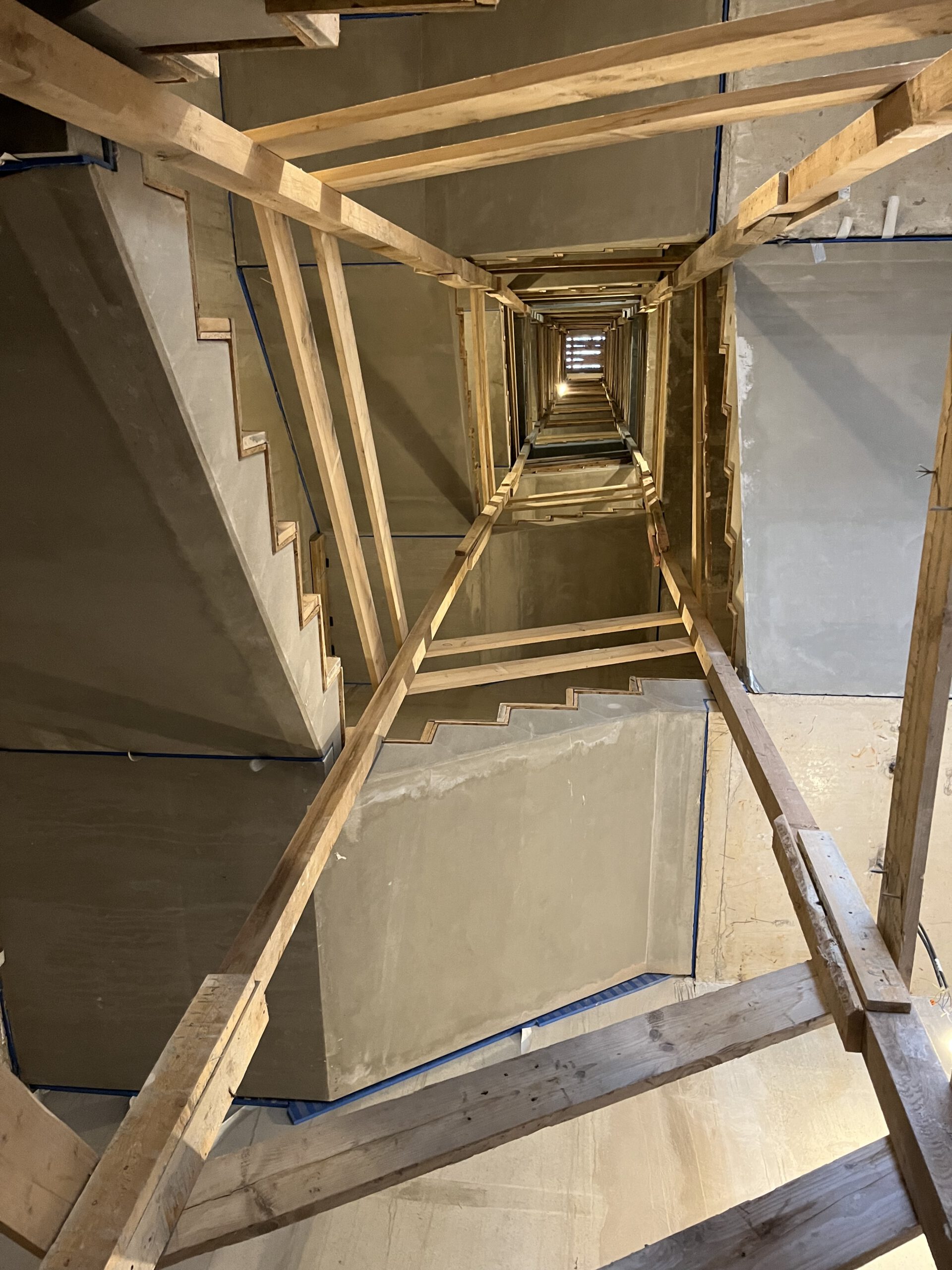 Umbau des Bodensilos: Neue Grundrisse und vorgestellte Balkone aus Stahlbeton-fertigteilen; Abfangung von Bestandsträgern; brandschutztechnische Ertüchtigung; neuer Dachstuhl.