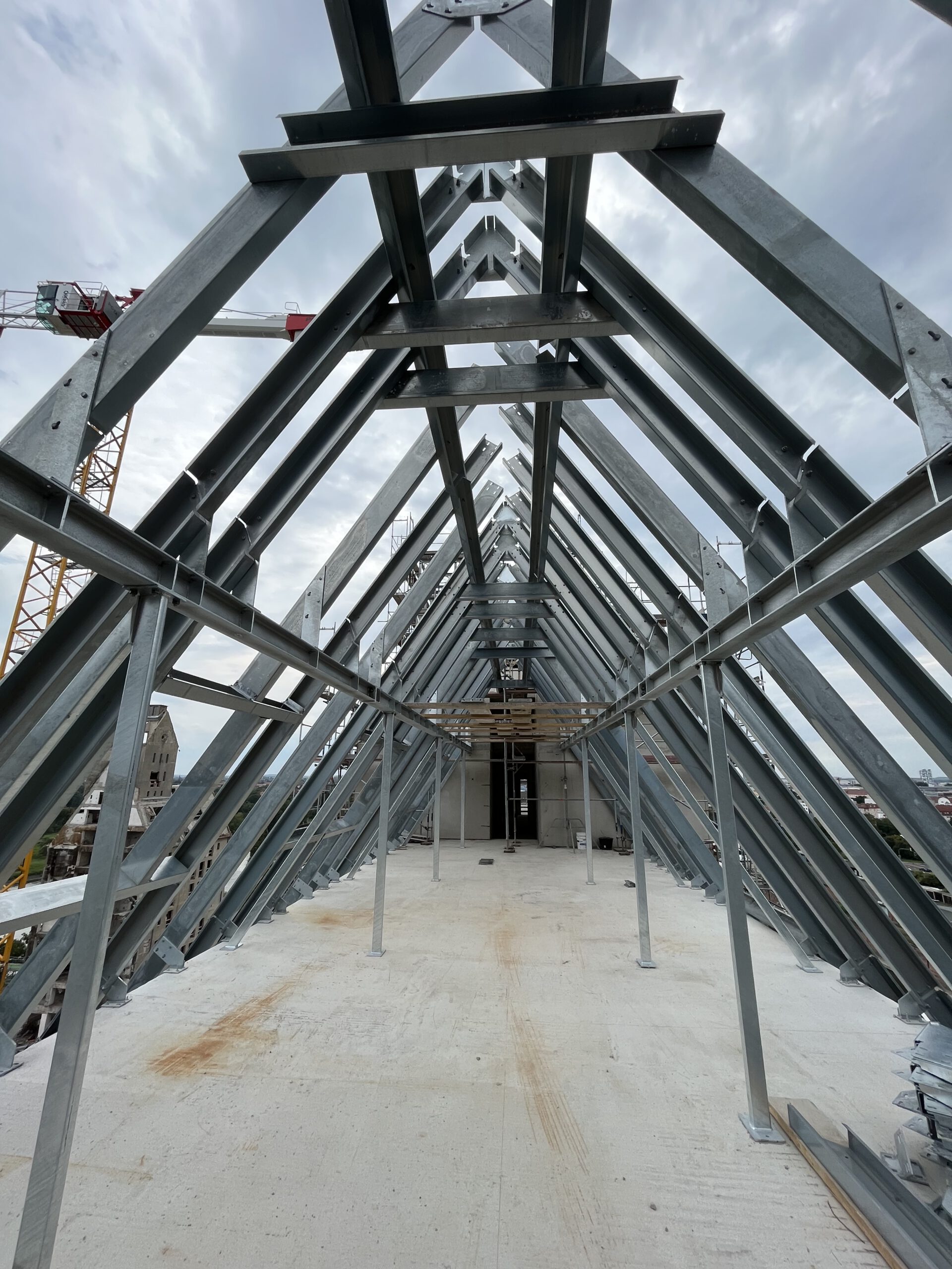 Besondere Bauweise: Stahldachstuhl aus kaltgeformten C-Profilen aus Brandschutzgründen.