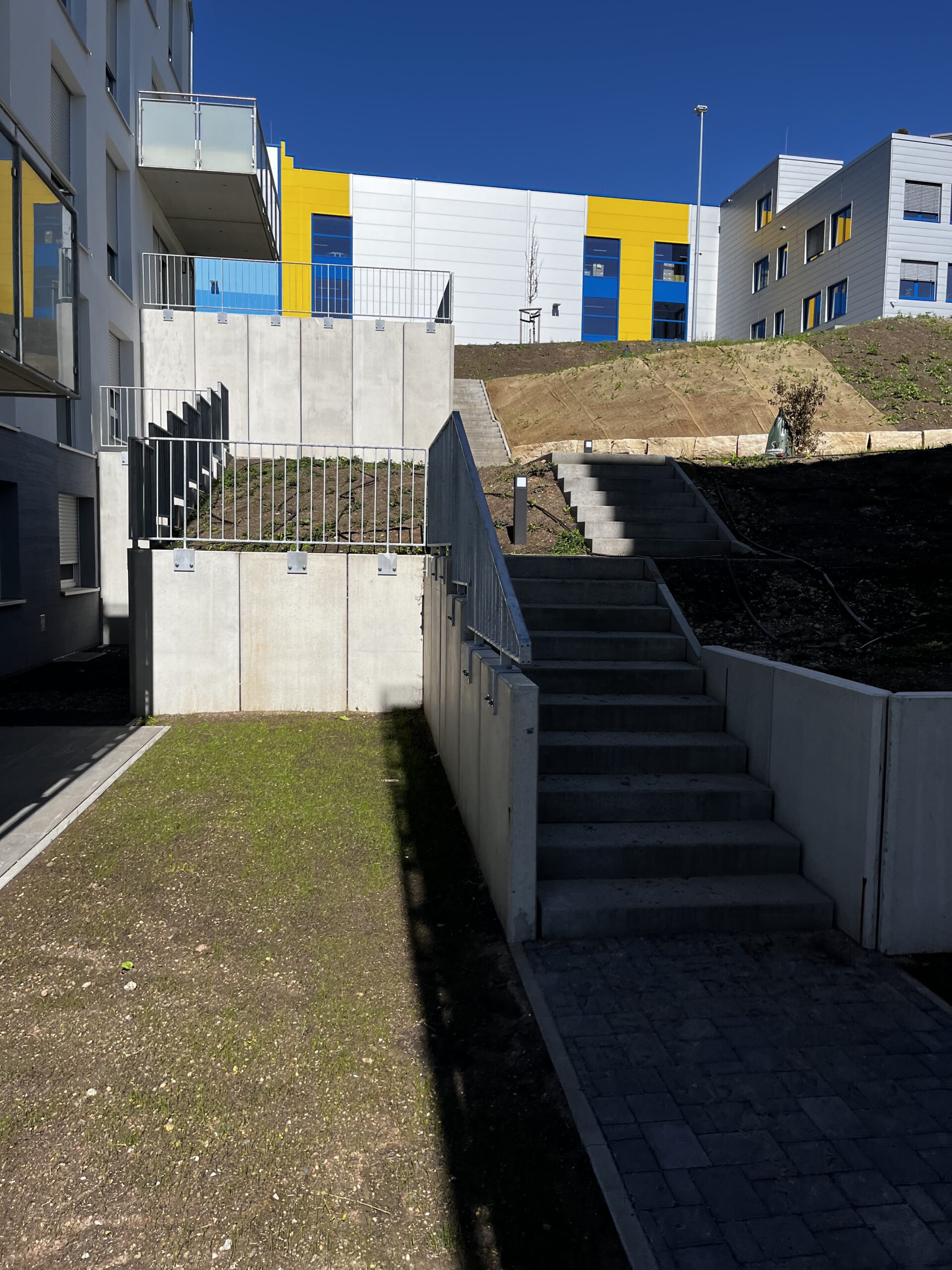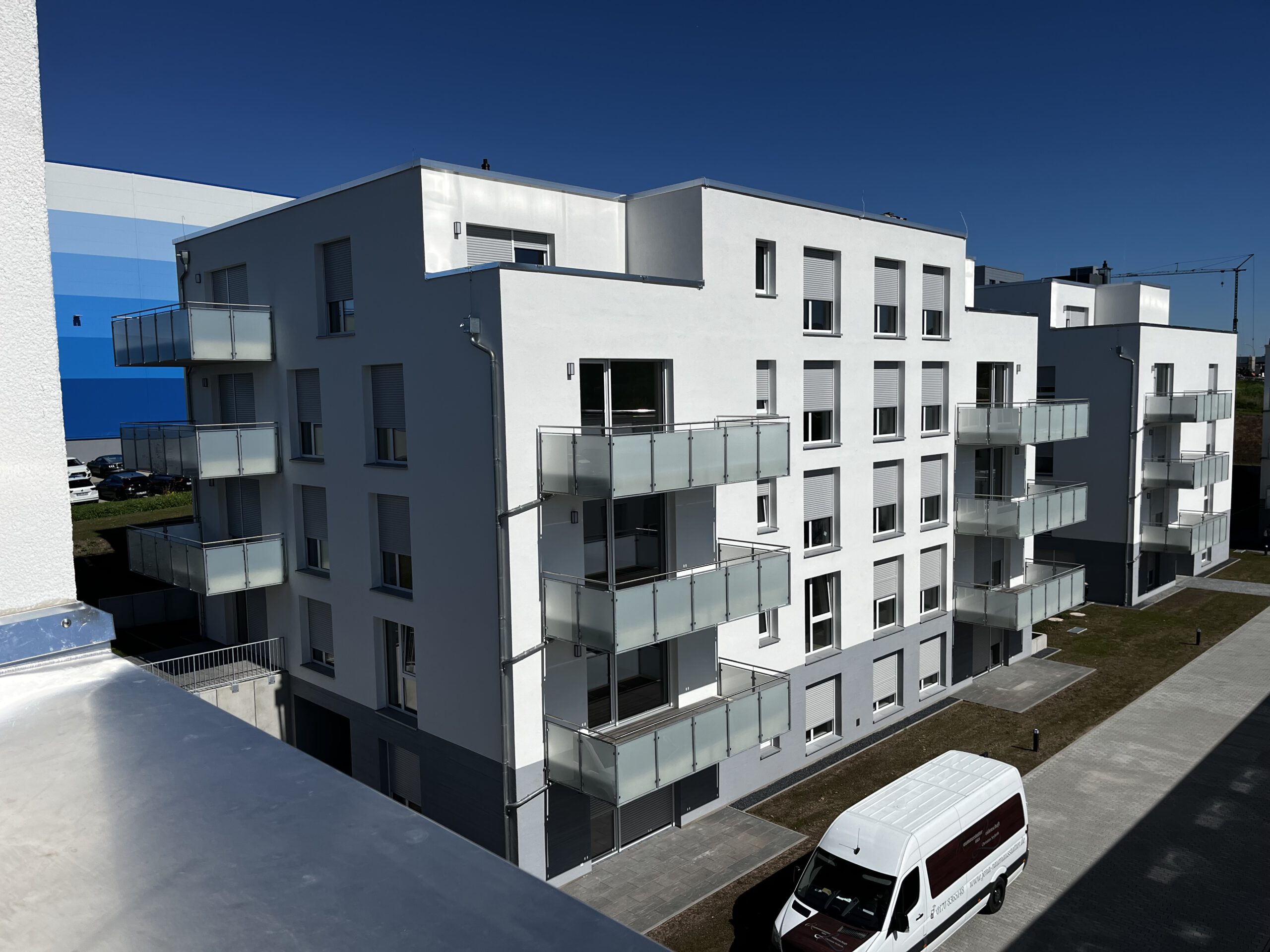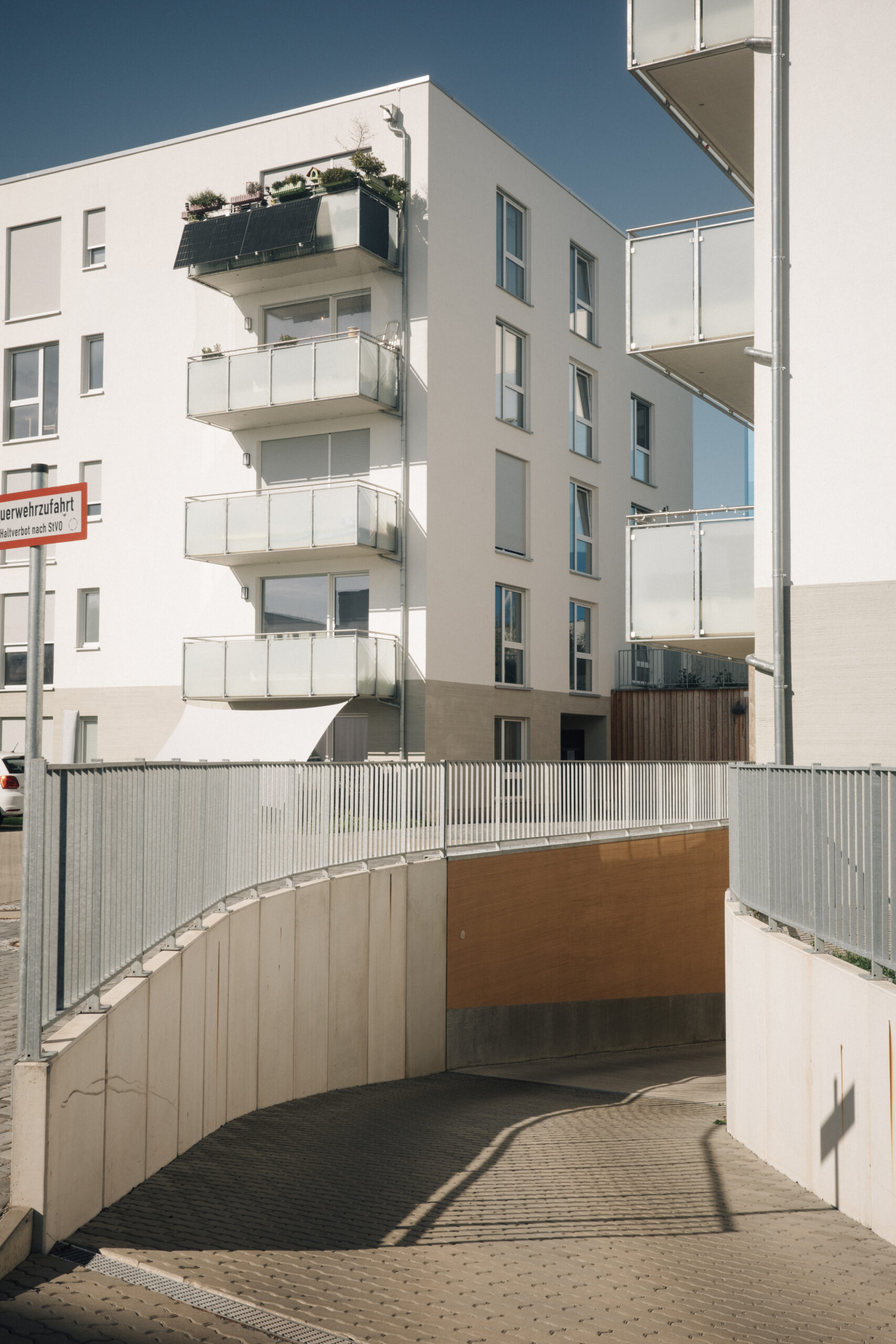 Neubau einer Wohnanlage aus 2 Wohnquartieren mit 5 bzw. 6 mehrgeschossigen Wohngebäuden und jeweils gemeinsam genutzter Tiefgaragen. Die Wohngebäude bestehen aus Stahlbetondeckenplatten auf Mauerwerkswänden, welche auf elastisch gebetteten Bodenplatten gegründet sind. Die Tiefgaragen sind Stahlbetonbauten, deren punkt- und liniengelagerte Decke teilweise eine variable Dicke besitzen und ebenfalls als Parkfläche, oder Feuerwehraufstellfläche genutzt werden. Die Stützen und Wände der Tiefgaragen werden über Einzel- und Streifenfundamente gegründet.