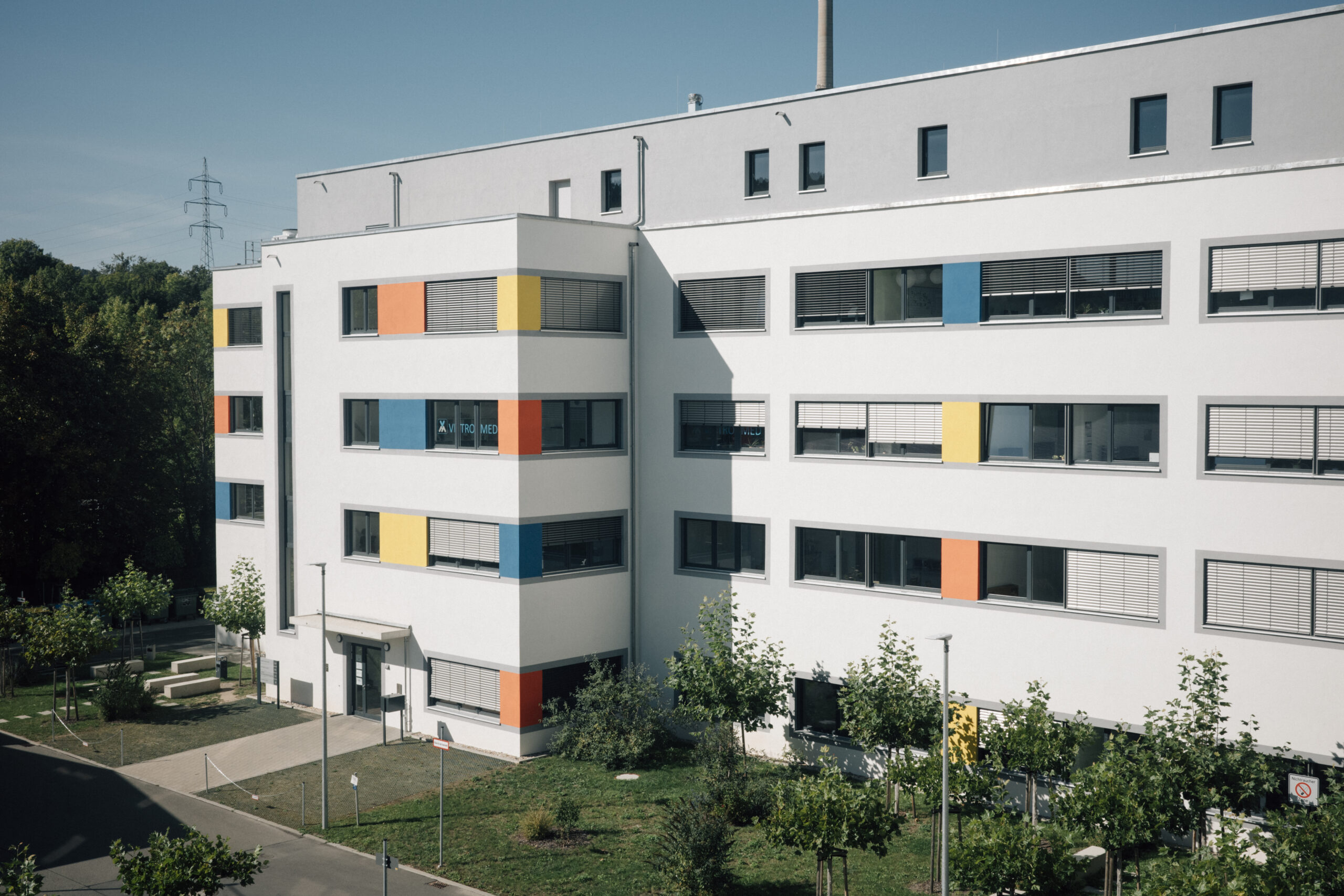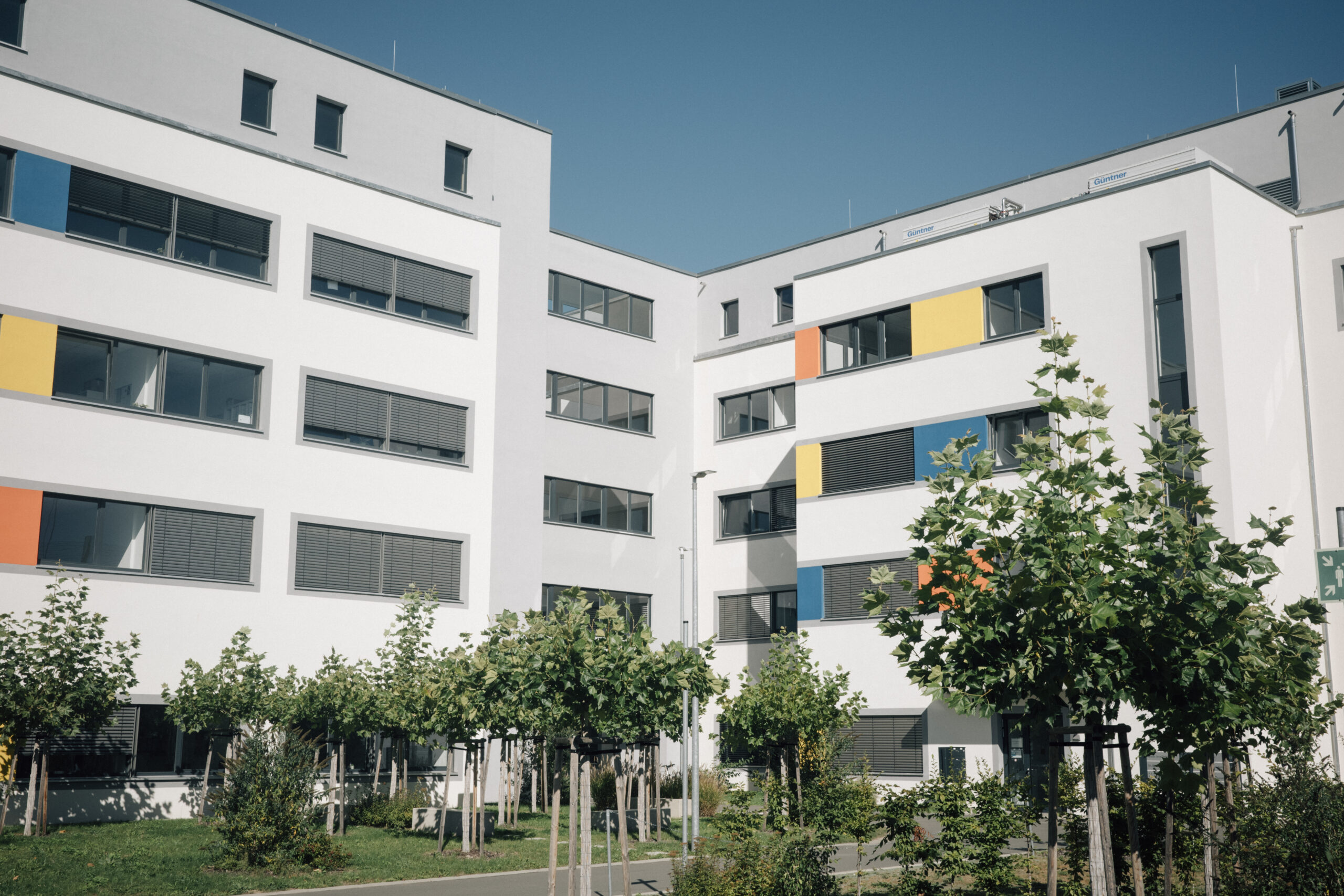 Neubau zweier 5-geschossiger Büro- und Laborgebäude aus Stahlbeton, die über einen Verbinder miteinander verbunden sind. Die Stahlbetondecken sind liniengelagert auf Unterzügen und Wänden. Das Aussteifungssystem wird über die Decken und eine ausreichende Anzahl an Wänden gewährleistet. Die Gründung erfolgt über eine freitragende Bodenplatte mit einem Trägerrost auf Großbohrpfählen.